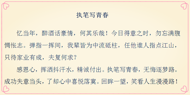 “現(xiàn)在,青春是用來(lái)奮斗的;將來(lái),青春是用來(lái)回憶的。”當(dāng)所有的經(jīng)歷化作記憶,那些年少時(shí)為理想揮灑的汗水,為成功付出的艱辛,終將成為彌足珍貴的人生財(cái)富。