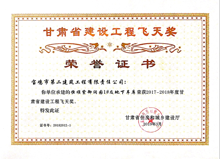 2017-2018年度甘肅省建設(shè)工程飛天獎(恒順紫御潤園1#及地下車庫)